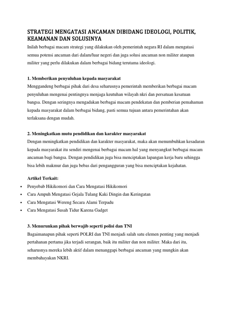 Strategi Indonesia menghadapi ancaman di bidang ideologi Untuk mencapai ketahanan di bidang ideologi masyarakat harus ikut serta dan andil dengan cara menjadikan pancasila sebagai pandangan hidup berbangsa dan bernegara serta pengamalan pancasila secara subjektif dan objektif. Ancaman bagi integrasi nasional tersebut datang dari luar maupun dari dalam negeri Indonesia sendiri dalam berbagai dimensi kehidupan seperti ideologi politik ekonomi sosial budaya serta pertahanan dan keamanan. Jadi dalam contoh artikel singkat ini saya akan memberikan beberapa strategi yang dilakukan oleh pemerintah negara RI militer dan juga masyarakat dalam mengatasi semua potensi ancaman dari dalam atau luar negeri.